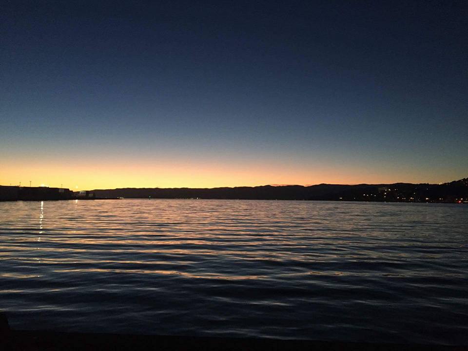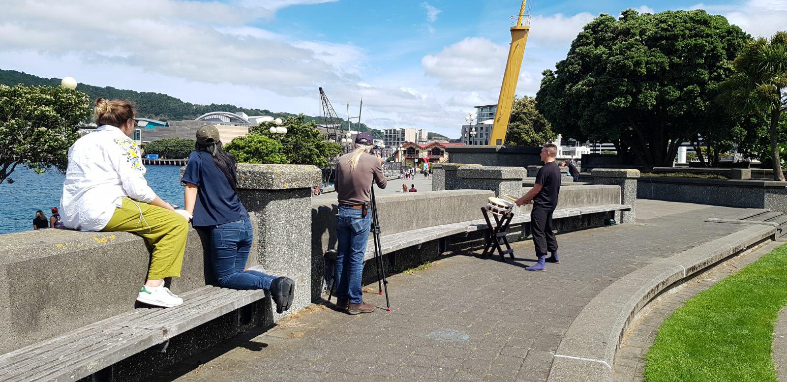 Our second and final show was on the front porch of the Wharewaka, which is a beautiful waterfront building, built in the style of a Marae with many exquisite wooden carvings around the entrance. We chose to play Seiryu, which is another song representing a river and the highlight of the song is the players moving up and down the drums as they play, in order to imitate the movements of the salmon migrating up and downstream. The location took full advantage of the packed Wharewaka building, full of people enjoying a special awards reception. Once the drums started, the crowds flooded out from the building, many with champagne in hand, to watch what was happening. It made for a terrific atmosphere and gave the crowd a big buzz of energy, which is exactly what a cold winter night calls for.