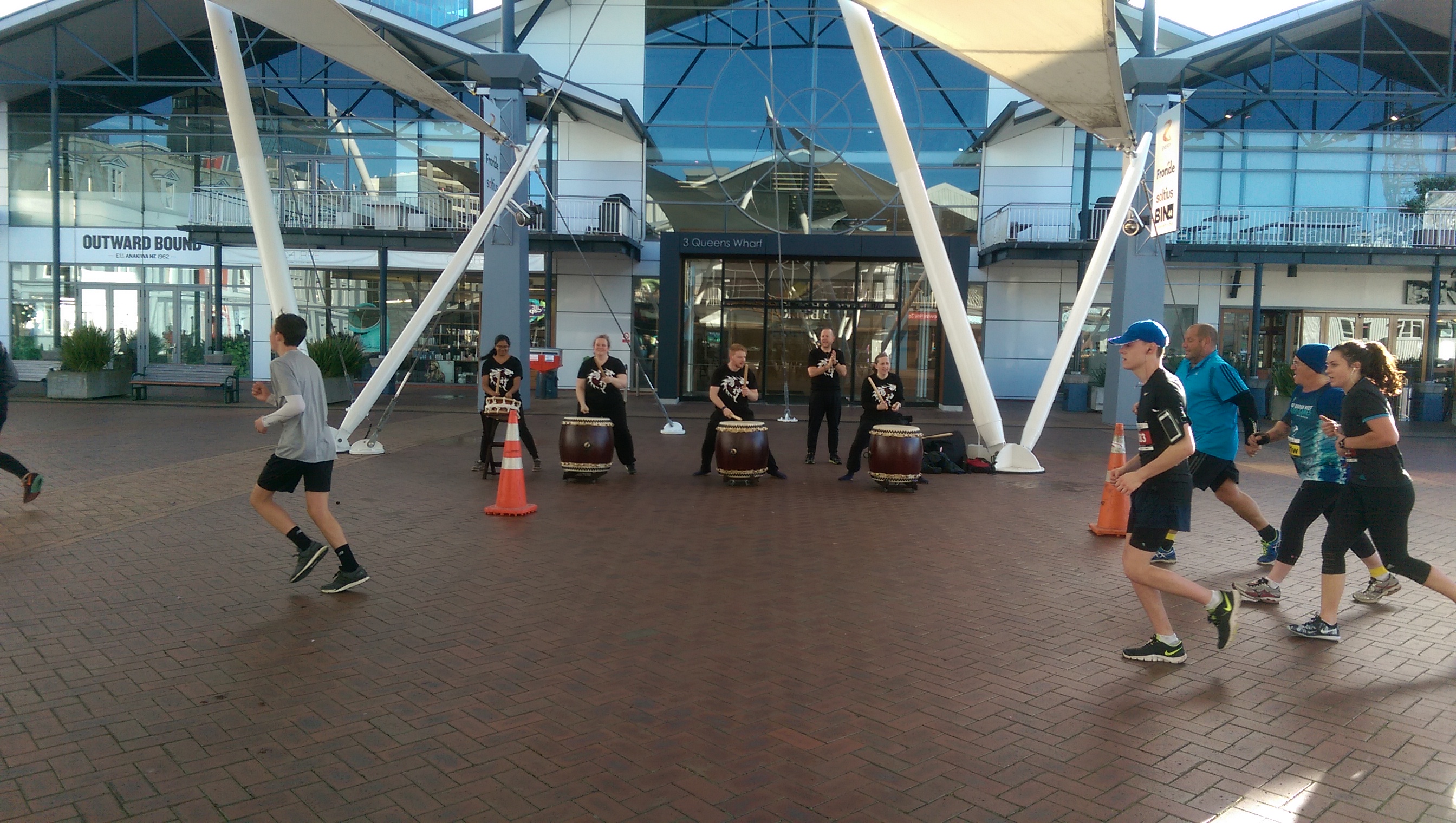 We were positioned in two spots this year, 2 kilometres from the start/finish line near the TSB Arena on Queens Wharf and close to the turn around point for the half marathon in Evans Bay. The team at Queens Wharf started our first lot of drumming at 7:30am for the marathon, then again an hour later for the half marathon and then it was drumming for 4 hours straight as each subsequent race came through.