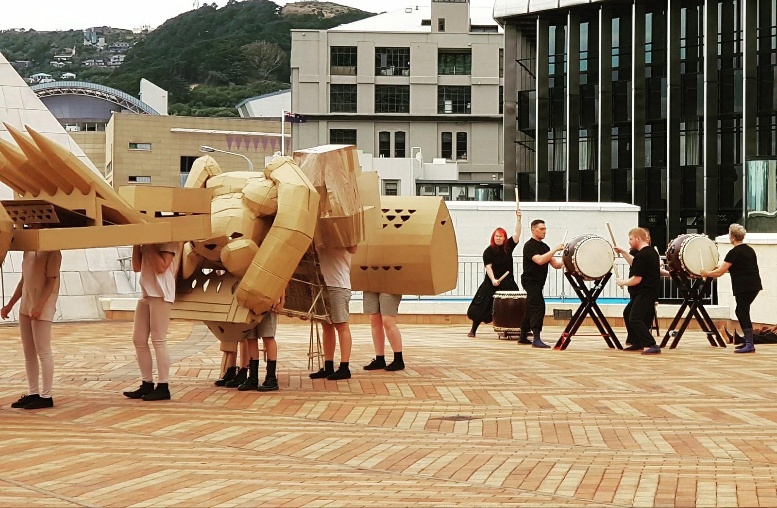 We also played a hypnotic heartbeat while actors paraded Yuka's cardboard sculptures around the square. Wellington turned on the good weather, with the sun coming out after some earlier threats of rain. Not a bad way to spend the day.
