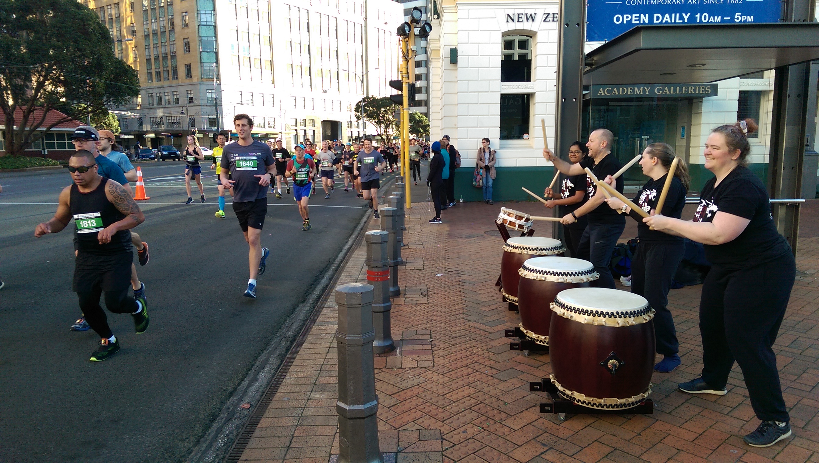 On Sunday 18 June 2017, 12 keen Narukami taiko players got up before sunrise to support Wellington’s running community in the Wellington Marathon, Half Marathon, 10K, 5K and kids mile/fun run. Our goal was to provide the runners with motivation to keep going. The Wellington Marathon became the sister marathon of the Senshuu International Marathon in Sakai in 2016. We performed for the marathon for the first time in 2016 too and loved it so much that we got out to support the runners again.