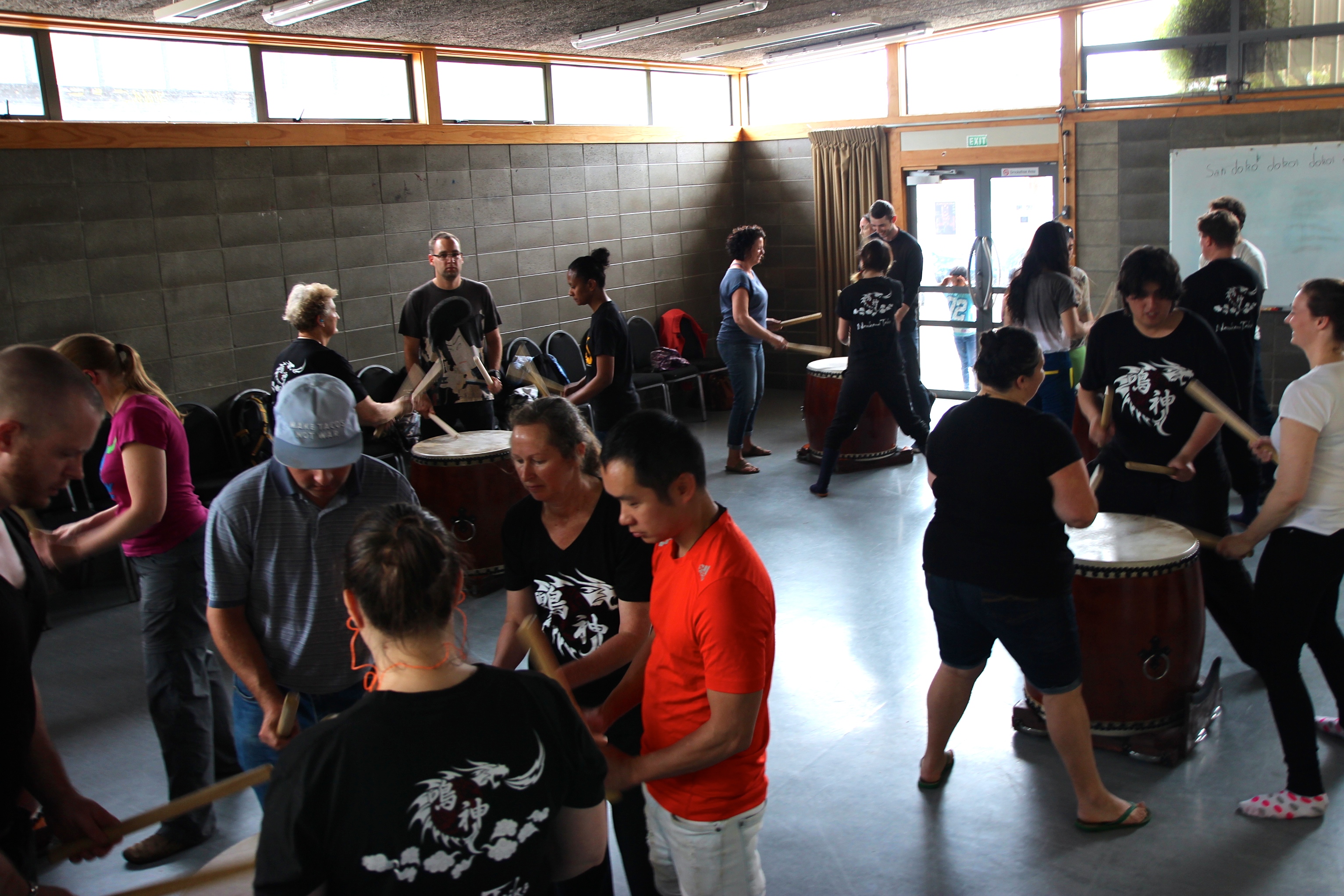 Work started on the pre-term open day with Jessie, Claire and Char visiting the Newtown Saturday Market to advertise the session for the next day. It must have been a successful venture as we had a good turn out ranging from toddlers to grandparents. The session started with simple drills, a demo such as you'd learn in a real class and then got people started on the beautiful Taikobayashi. Intermixed with that was a couple of favourites performed by the current team to demonstrate what the goals of the class are. The place was buzzing and it seemed like everyone just wanted to have a go! A number of keen new recruits have signed up as a result, and we can't wait to meet and play alongside them.