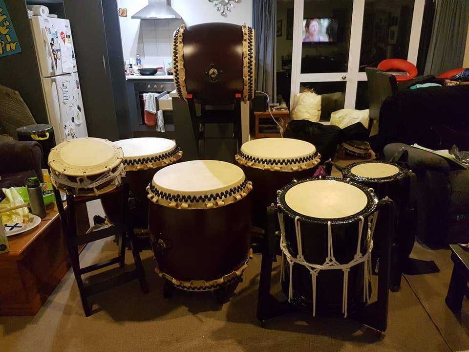 On our trip to Japan last year, we visited the drum maker Suwakougei in Saitama; A two hour train ride out of Tokyo. Greeting us on arrival, the friendly staff took us into their display room, and for about 2 hours we communicated in my broken Japanese. Finding all the information we could on the different types of drums they have, what woods they use, skin types, everything! They took us into their store room, let us measure everything and ask ridiculous questions, like "what kind of candle do you use to tie the shime?". For some reason me mixing the word for rope with candle. After working with Suwakougei and painstakingly deciding what drums we wanted, we then began the work of oraganising shipping. As great as Suwakougei are, they do not offer international shipping, making it a lot more difficult to get drums from them. Once leaving Japan we left it to Suwakougei and the shipping company to get the drums on the boat to Wellington. Finally on March 17th they arrived.